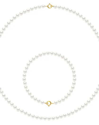 Parure Collier + Bracelet Or Jaune & Perles d'Eau Douce Rondes blanc naturel