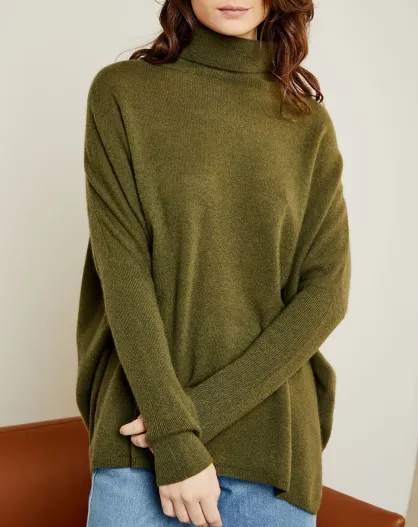 Pull poncho 100% Cachemire Olivia Col roulé kaki