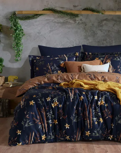 Parure housse de couette 100% Satin de Coton Bambou Flower bleu/marron/jaune