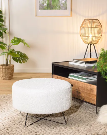 Pouf rond tissu bouclette pieds croisés Albane blanc - 55x55x35 cm