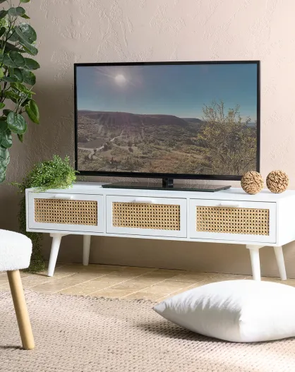 Meuble TV cannage rotin Sandro blanc - 120x40x39.5 cm
