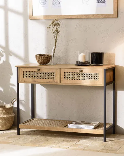 Console 2 tiroirs 1 étagère rotin marron/noir - 100x40x75 cm