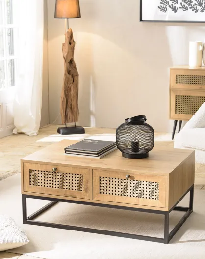 Table basse 4 tiroirs rotin marron - 90x60x40 cm