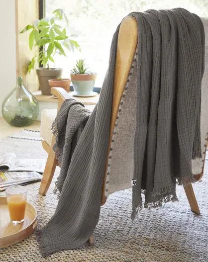 Plaid à franges Gaze de coton Gaïa anthracite