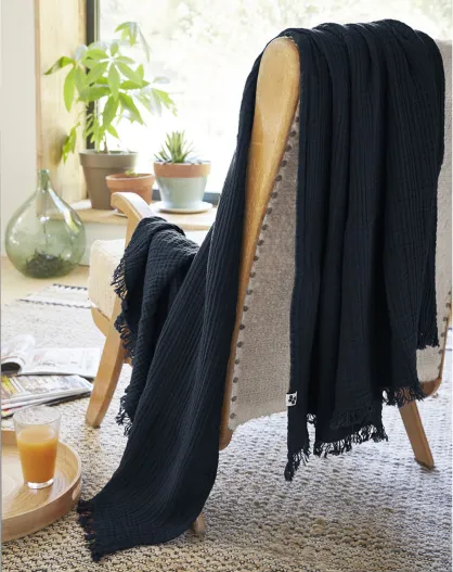 Plaid à franges Gaze de coton Gaïa bleu foncé