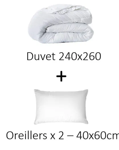 2 Oreillers + 1 Couette Hiver-Eté Thermoregulante blancs - 240x260 cm