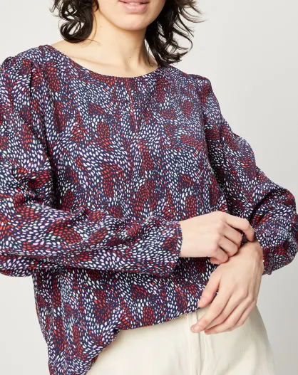 Blouse fluide à manches bouffantes motifs prune/bleu