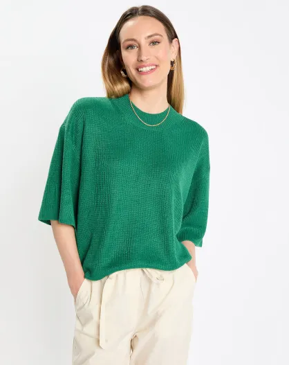 Pull 100% Lin manches courtes Col R vert foncé