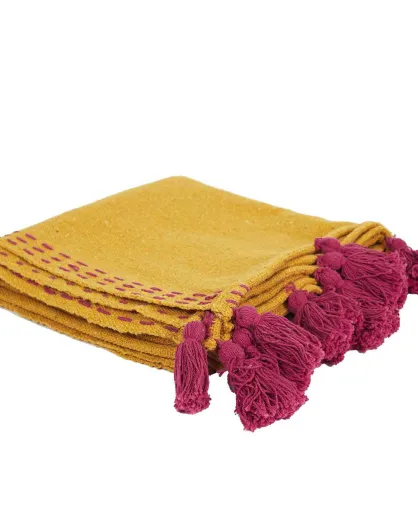 Jeté de canapé surpiqué pompons jaune/rose - 130x170 cm