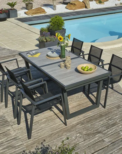 Ensemble de jardin Table OLHOS-TB250 avec rallonge + 6 fauteuils ALU-MIAMI-FT empilables gris anthracite
