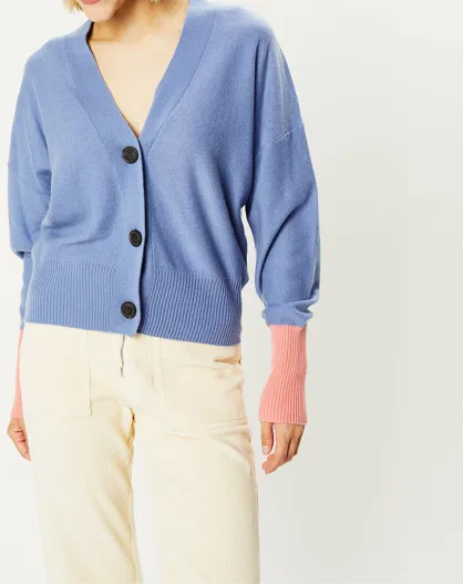 Cardigan 100% Cachemire Fabiola col V bicolore bleu/rose
