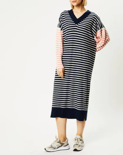 Robe pull marinière 100% Cachemire Fabia col V rayures marine/écru/rose