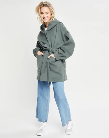Manteau 3/4 léger 100% Laine à capuche kaki