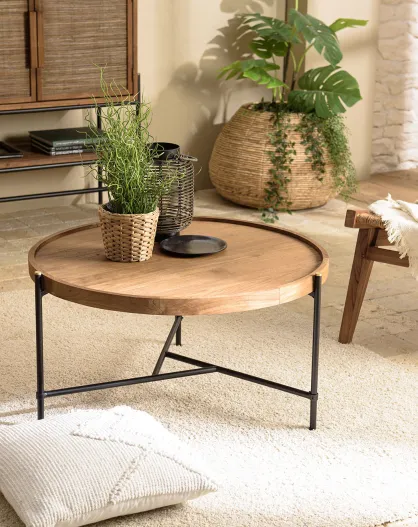 Table basse ronde plateau en bois de teck recyclé Sixtine bois/noir - D.78x40.5 cm