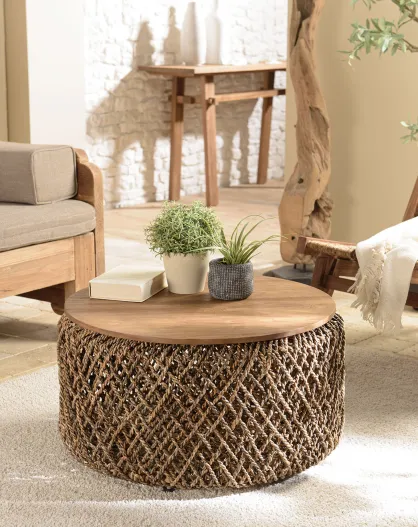 Table basse ronde en tissage de fibre de cocotier Sixtine bois - D.70x36 cm