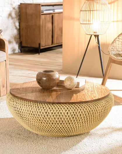 Table basse ronde en rotin beige plateau amovible Sixtine naturel - D.80x32 cm