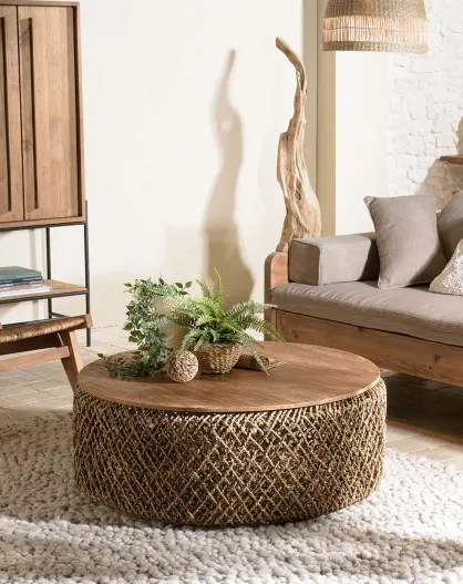 Table basse ronde en tissage de fibre de cocotier Sixtine bois - D.100x36 cm