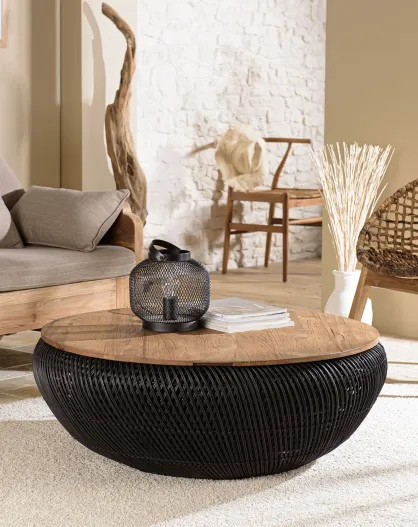 Table basse ronde en rotin noir plateau amovible Sixtine bois/noir - D.100x36 cm