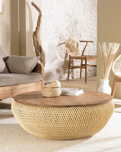 Table basse ronde en rotin beige plateau amovible Sixtine naturel - D.100x36 cm