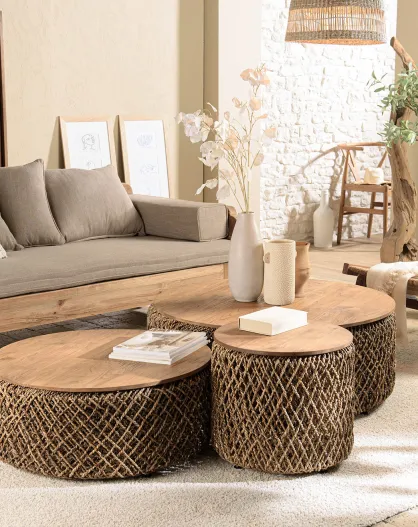 3 Tables basses rondes en tissage de fibre de cocotier Sixtine bois