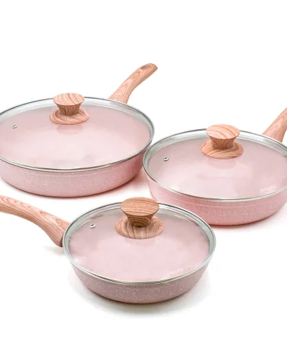 3 Poêles avec couvercle induction en aluminium forgé Stonerose roses - D.20/24/28 cm