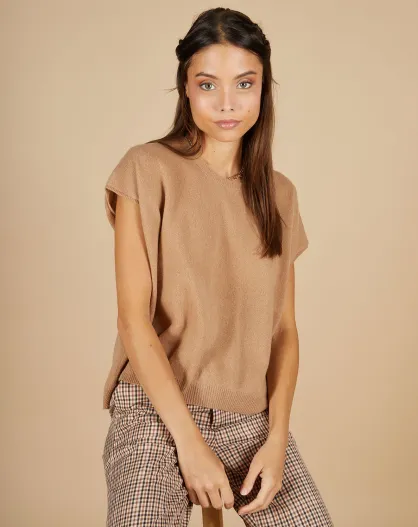 Pull 100% Cachemire manches courtes Charline boutons au dos camel