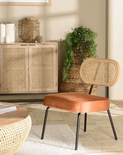 Chaise velours dossier rotin Albane orange - 50x57x72 cm