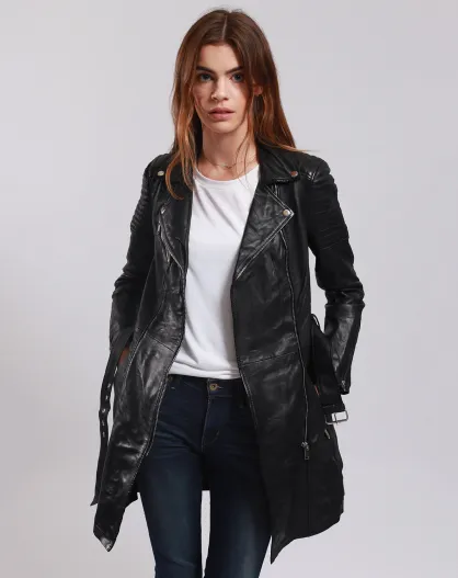 Veste en Cuir Longue Lainna noire
