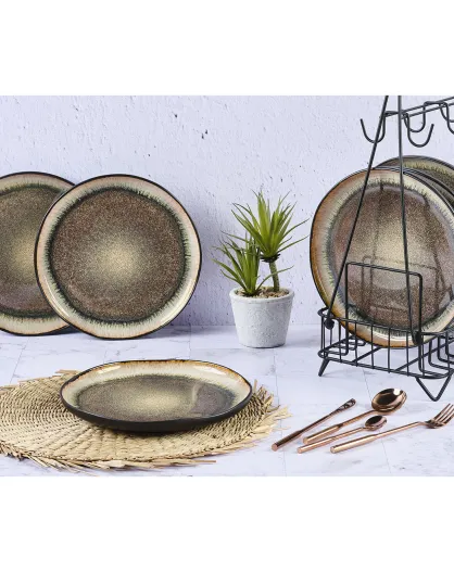 6 Assiettes plates en Grès Iris beige/marron - D.26 cm