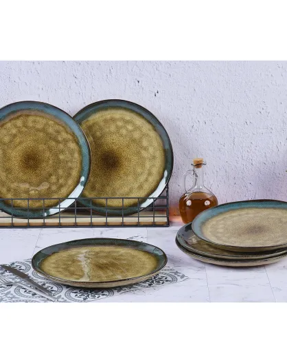 6 Assiettes en Grès Island kaki/bleu - D.28 cm