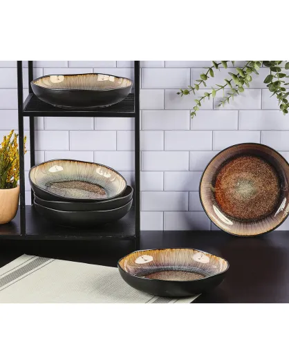 6 Assiettes creuses en Grès Iris beige/marron - D.22.5 cm
