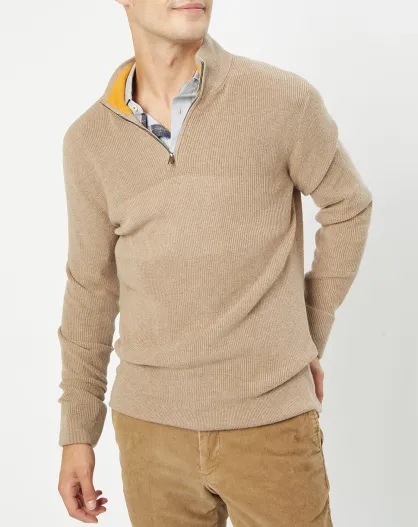 Pull en Coton & Cachemire 1/2 zip Cah Rib beige