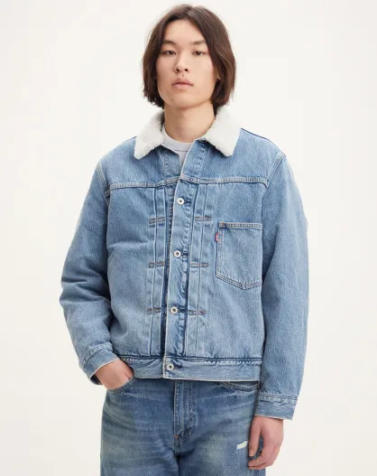 Veste courte en Coton denim col façon sherpa Trucker bleue