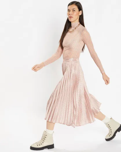 Jupe mi-longue plissée Charlotte imprimé graphique marron/rose