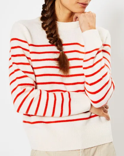 Pull en Laine & Cachemire Sadi marinière col rond écru/orange