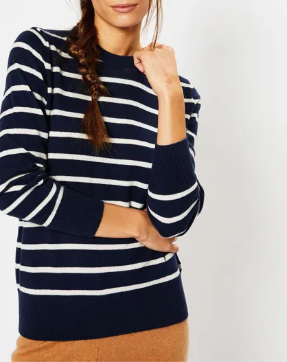Pull en Laine & Cachemire Sabri col rond rayé marine/écru