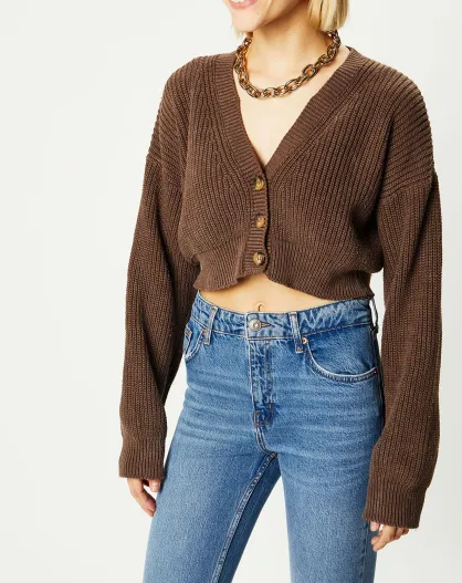Cardigan cropped Washed Rib marron