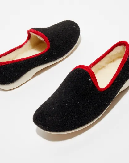 Chaussons charentais fourrés en Laine noir/bord rouge