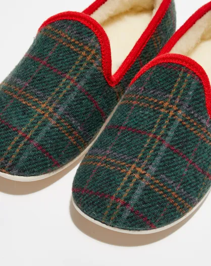 Chaussons charentais fourrés en Laine tartan vert/bord rouge