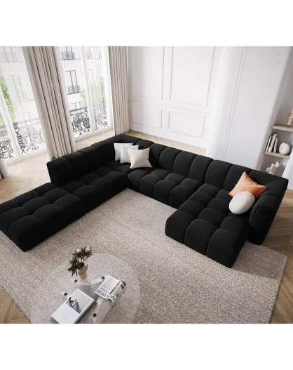 Canapé d'angle droit Panoramique Modulable En Velours Adams 7 Places noir - 316x276x70 cm