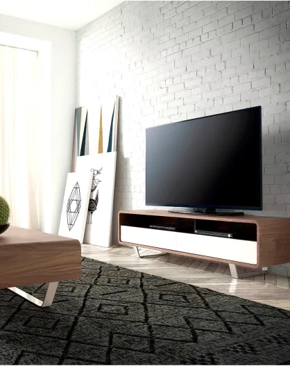 Meuble TV 2 tiroirs laqué noyer/blanc - 150x40x40 cm