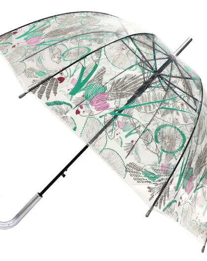 Parapluie droit cloche transparent - Imprimé feuilles tropicales vertes transparent/bleu