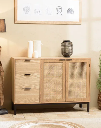 Buffet 3 tiroirs 2 portes cannage pieds métal marceau naturel - 110x40x78.5 cm