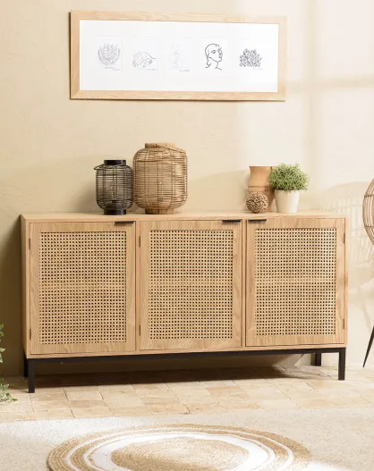 Buffet 3 portes cannage pieds métal marceau naturel - 144x40x75.5 cm