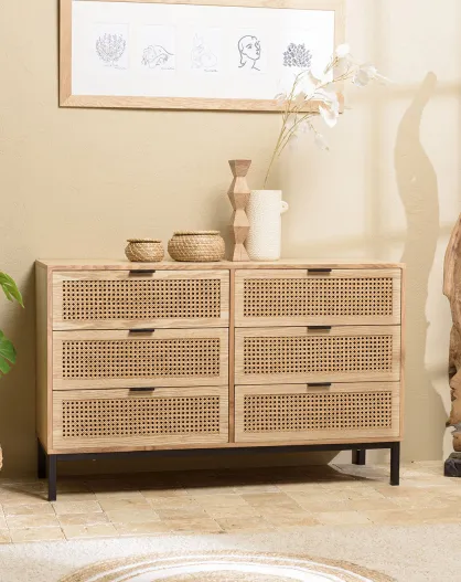 Commode 6 tiroirs cannage pieds métal marceau naturel - 120x40x75.5 cm