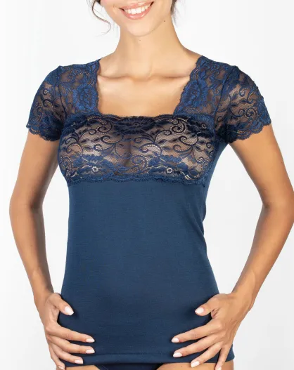 Top manches courtes en Laine mélangée dentelle bleu marine