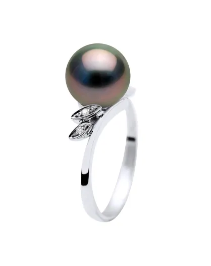 Bague Or Blanc, Diamants 0.04 ct & Perle de Tahiti Ronde noire