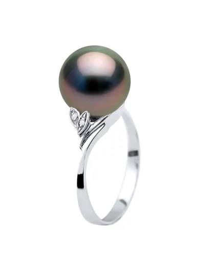 Bague Or Blanc, Diamants 0.04 ct & Perle de Tahiti Ronde noire