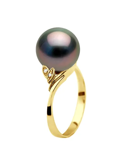 Bague Or Jaune, Diamants 0.04 ct & Perle de Tahiti Ronde noire