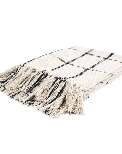 Plaid jeté de lit à carreaux beige/noir - 125x150 cm